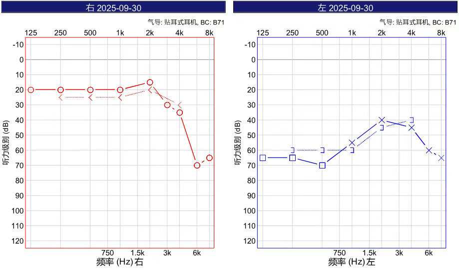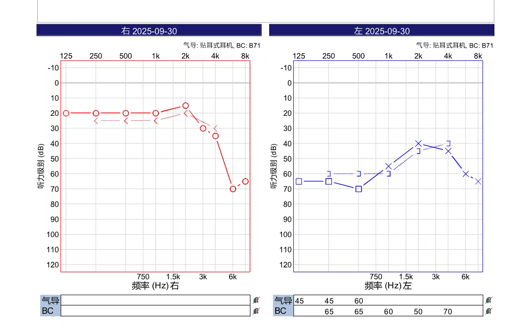 左耳突发性耳聋,听力急剧下降。