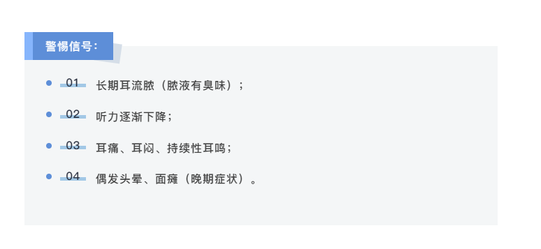 如果出现听力下降、耳流脓、耳鸣等症状,一定要及时到正规医院就诊,明确诊断并接受规范治疗,切勿延误病情,造成不可挽回的后果。